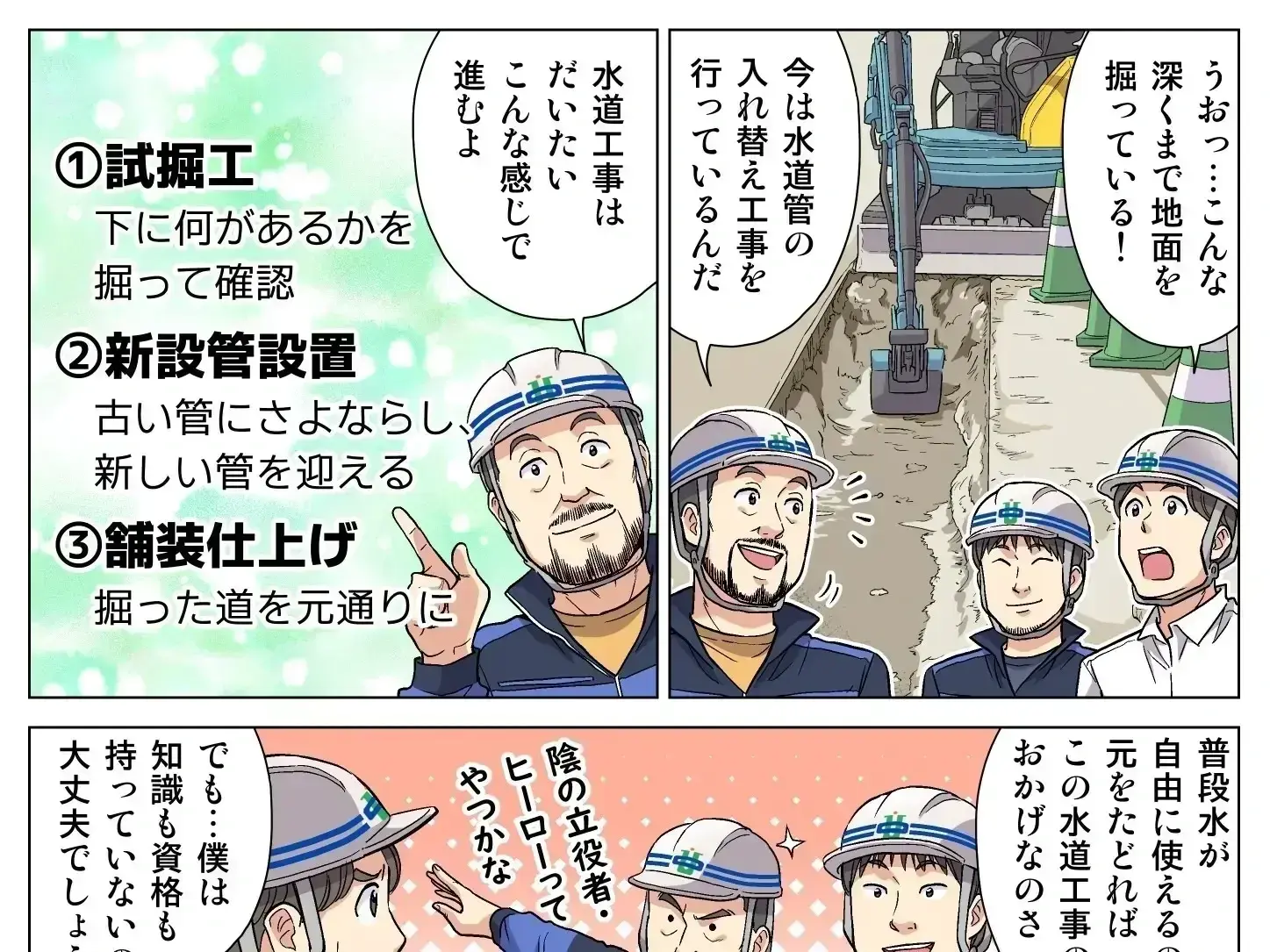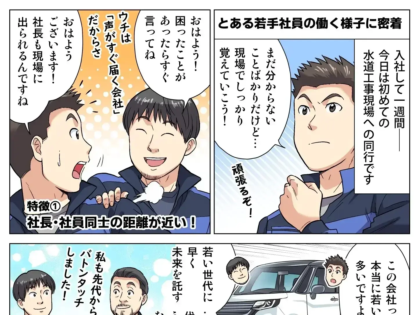 土木作業員や施工管理など、現場で活躍する社員たちの仕事を、漫画でわかりやすく紹介しています。東京都府中市の株式会社大宇工業では、未経験でも安心してスタートできる理由があります。